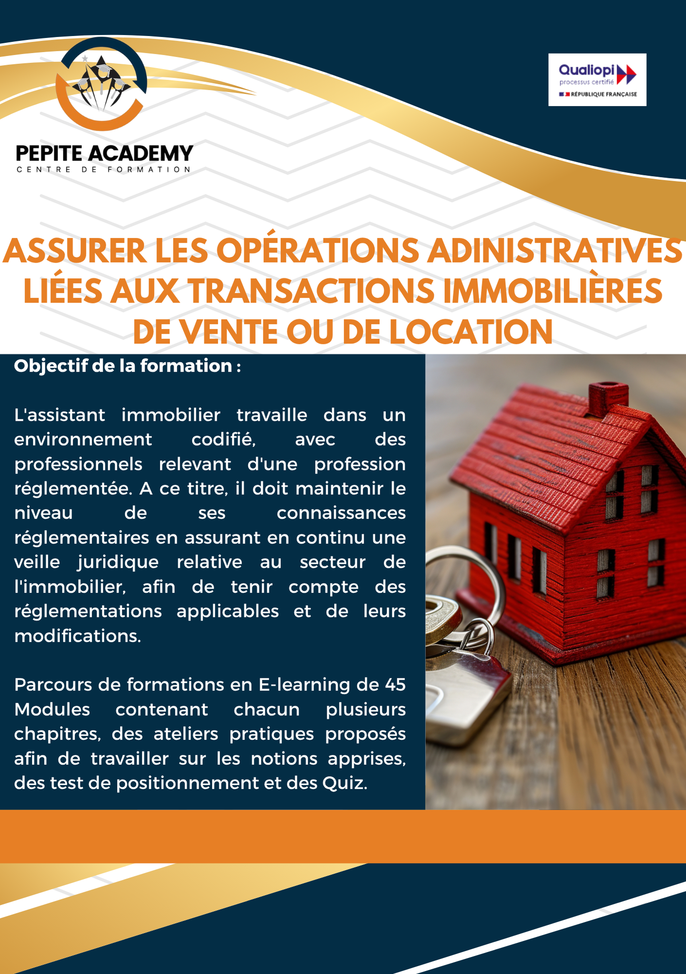 Structurée autour de 45 modules interactifs, elle combine e-learning, ateliers pratiques et évaluations pour aborder tous les aspects clés : cadre réglementaire, organisation de la vente ou de la location, relations avec notaires et banques, fiscalité, gestion des contrats spécifiques, et formalités obligatoires. Le participant bénéficie d’un accompagnement progressif, adapté au secteur réglementé de l’immobilier, afin de garantir la maîtrise des démarches, outils et législations en vigueur.