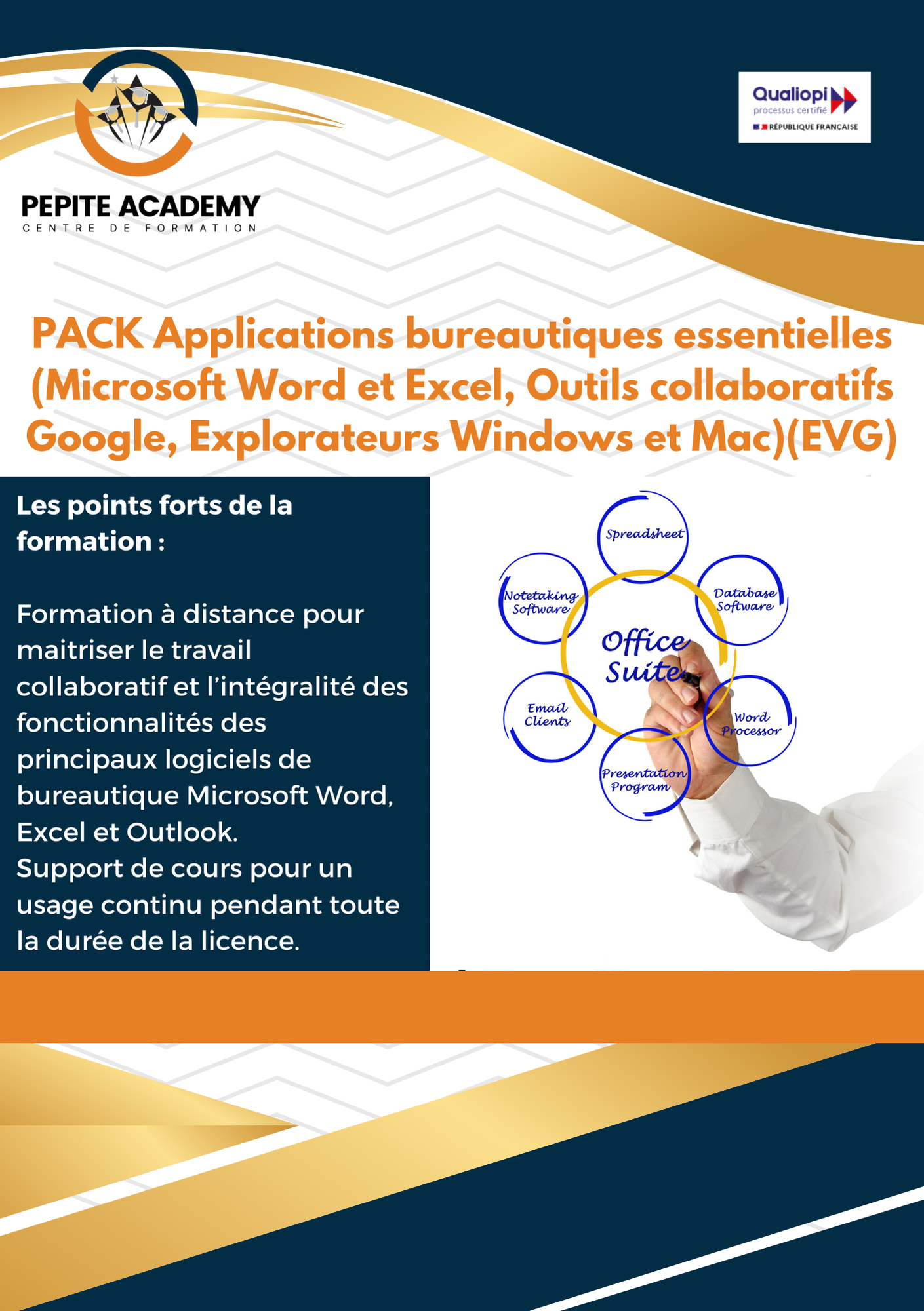 des principaux logiciels de bureautique Microsoft Word, Excel et Outlook. - Support de cours pour un usage continu pendant toute la durée de la licence.