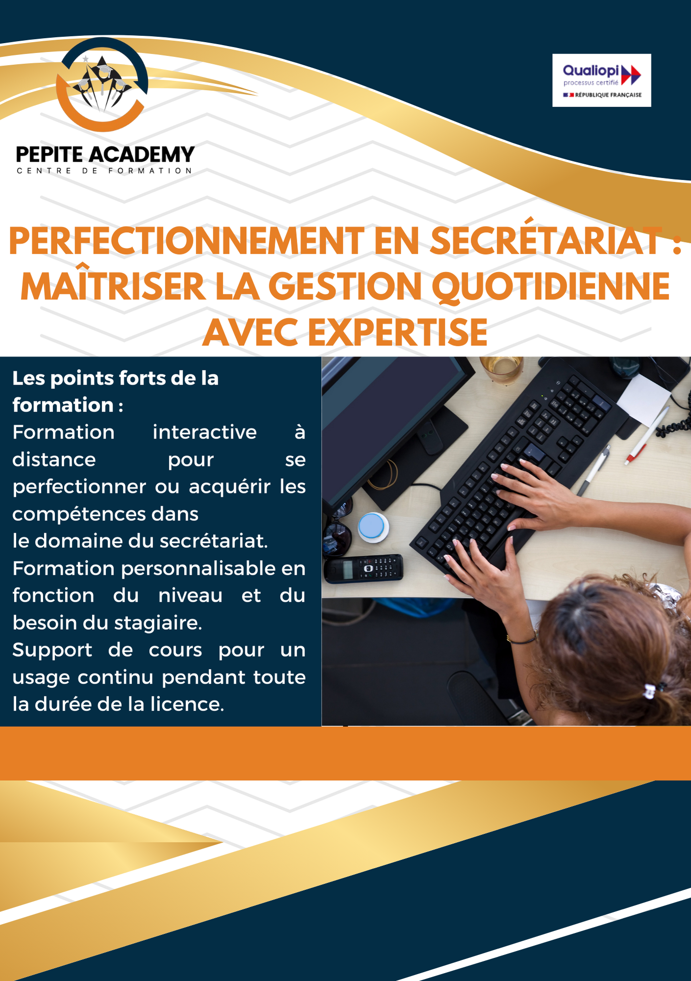 Entièrement interactive et personnalisable selon le niveau du participant, elle couvre l’ensemble des fondamentaux du secrétariat : organisation interne, communication et gestion du temps, rédaction des écrits administratifs, techniques d’accueil, ainsi que la maîtrise des outils numériques pour la présentation de documents professionnels.