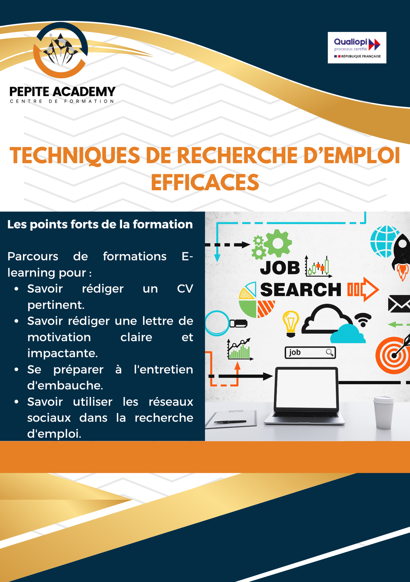 La formation en ligne « Techniques de recherche d’emploi efficaces » permet d’acquérir toutes les compétences pour réussir sa candidature : rédaction d’un CV et d’une lettre de motivation percutants, préparation aux entretiens d’embauche, utilisation stratégique des réseaux sociaux et nombreuses ressources pédagogiques accessibles à chaque étape.